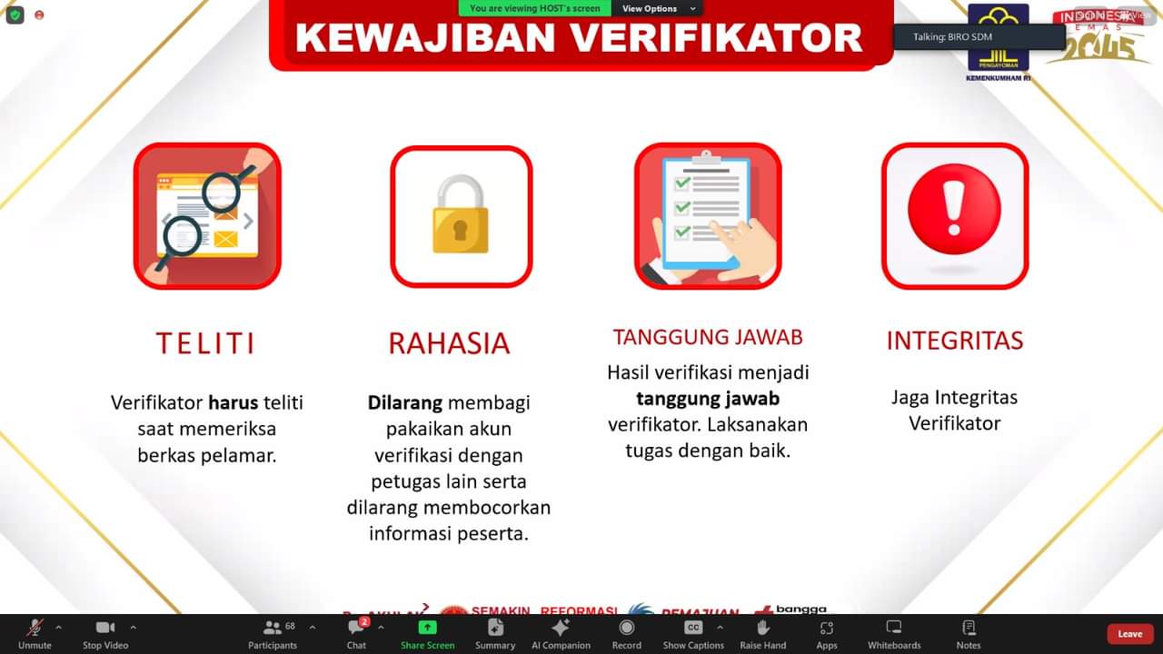Reza Aditiyas Ananda, selaku Ketua Pokja, dan Tri Darma Manulang, Kabag Perencanaan SDM dan Tata Usaha Sekretariat Jenderal Kemenkumham, memberikan arahan dan penjelasan terkait berbagai hal teknis verifikasi dokumen. Keduanya menekankan pentingnya ketelitian dan obyektivitas dalam melakukan verifikasi berkas pelamar.
