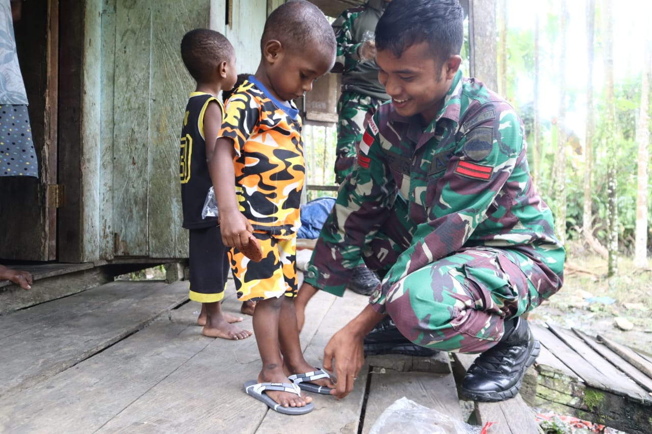 Kabupaten Keerom - Satuan tugas pengamanan perbatasan Yonif 122/TS menjalin kebersamaan antara personel Pos Kotis dengan masyarakat melalui kegiatan komunikasi sosial, memberikan sendal kepada anak-anak dan berikan pelayanan kesehatan di Kampung Wonorejo Pir IV, Distrik Mannem, Kabupaten Keerom, Papua (01-09-2024).