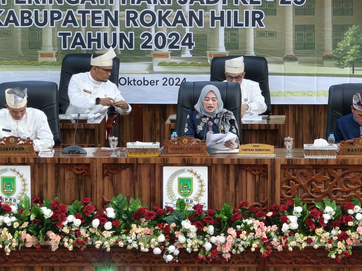 Rapat paripurna tersebut dipimpin langsung oleh Ketua Sementara DPRD Rokan Hilir."Ilhammi S.Tr.Keb di dampingi Plt Bupati Rokan Hilir, H.Sulaiman, Sidang dimulai pukul 10.00 WIB itu turut dihadiri Pjs Gubernur Riau diwakili Asisten Administrasi Umum Sekdaprov Riau dan seluruh anggota DPRD Rokan Hilir, serta Prokopimda Kabupaten Rokan Hilir serta seluruh undangan lainya.